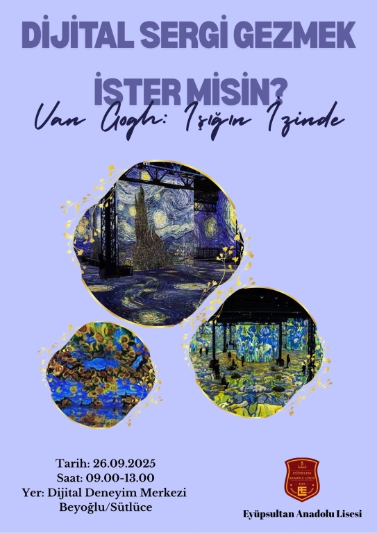 26 Eylül Cuma günü okulumuz 9. sınıf öğrenci ve öğretmenlerimiz ile birlikte “Van Gogh: Işığın İzinde” sergisini deneyimledik. Modern teknolojinin sanatla harmanlandığı bu sergiden aldıkları ilhamla çeşitli edebî ürünler yylül aratacak olan öğrencilerimizin eserlerini görmeyi sabırsızlıkla bekliyoruz.
